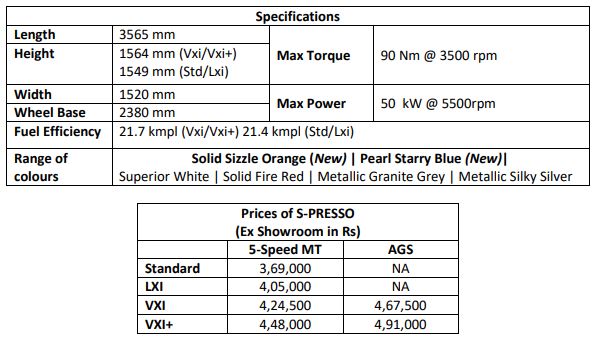 S-PRESSO will be sold countrywide through the extensive ARENA retail network and is packed with more than 10 safety features and is compliant with all safety regulations. Maruti Suzuki will offer several best -in-its class features to customers with S-PRESSO.