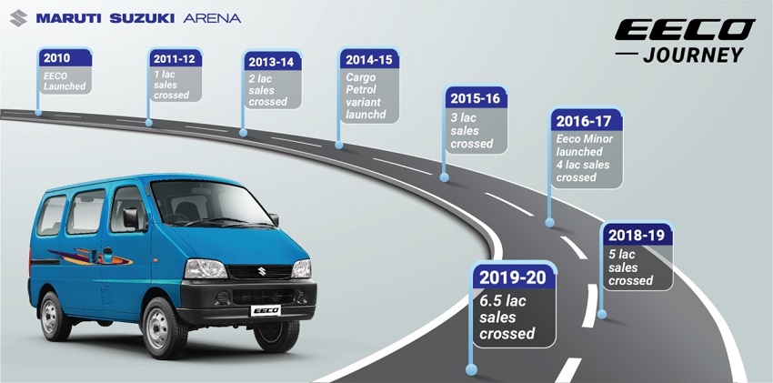 Maruti Suzuki Eeco was launched in January 2010 and crossed the mark of 6.5 lakh unit cumulative sales. Brand Eeco with its practical and spacious design and powerful performance enjoys an undisputed leadership with 87% market share in the van segment. Truly positioned as ‘Parivaar aur vyapaar ka No. 1 saathi’, the multi-purpose Eeco is engineered to perform twin objectives of being a brilliant family transport as well as a dependable business vehicle.