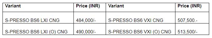 Introducing S-PRESSO BS6 S-CNG, Mr. Shashank Srivastava, Executive Director (Marketing & Sales), Maruti Suzuki India Limited said, “With the launch of S-PRESSO BS6 S-CNG, we are strengthening our efforts towards sustainable green mobility. The S-PRESSO S-CNG is designed to deliver optimum performance, safety, engine durability, convenience, and mileage. Moreover, The S-PRESSO has successfully carved a niche for itself and fulfills the need for a dynamic, stylish and youthful mini SUV. This launch also helps augment our commitment towards Mission Green Million, announced at the Auto Expo 2020. Maruti Suzuki, with its unmatched portfolio of CNG and Hybrid vehicles, has been the preferred choice of customers owing to the affordability and high-fuel efficiency of its green vehicles.”