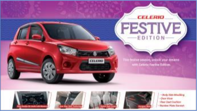 New Delhi: To amplify the spirit of the festive season, Maruti Suzuki offers its customers festival edition variants of three of its best-selling cars; Alto, Celerio and WagonR. These special festive edition variants are accentuated with a dynamic accessory kit that offers striking looks, style and comfort. Meant for the aspirational entry-level buyers, it aims to thrill the customers seeking a value-for-money and feature-rich offering to brighten up their festivities.