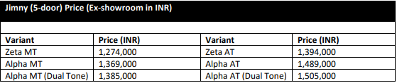 Announcing the prices of the Jimny, Mr. Hisashi Takeuchi, Managing Director & CEO, Maruti Suzuki India Limited, said, “We are privileged to introduce the legendary Jimny, a symbol of adventure, into the Indian market. With its timeless design and exceptional off-road capabilities powered by Suzuki's ALLGRIP PRO (4WD) technology, the Jimny has been breaking stereotypes for over 5 decades since its global debut in 1970. The launch of Jimny (5-door) marks an exhilarating milestone in our SUV portfolio and will play an important role in our goal of becoming the country’s largest SUV maker. We are delighted with the response it has received from both prospective customers and critics alike. We are confident that Jimny will empower customers to explore uncharted territories and power through all obstacles with a #NeverTurnBack attitude.”