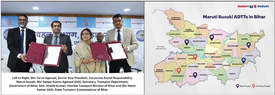 Patna/ New Delhi: Maruti Suzuki India Limited (MSIL) signed the Memorandum of Agreement (MoA) with the Transport Department, Government of Bihar to automate driving license test tracks at Bhagalpur, Darbhanga, Gaya, Purnia and Saran. The MoA was signed in the presence of Smt. Sheela Kumari, Hon’ble Transport Minister of Bihar and Shri Sanjay Kumar Agarwal (IAS), Secretary, Transport Department, Government of Bihar. The MoA was signed by Shri Navin Kumar (IAS), State Transport Commissioner, Government of Bihar and Shri Tarun Agarwal, Senior Vice President, Corporate Social Responsibility, Maruti Suzuki.
