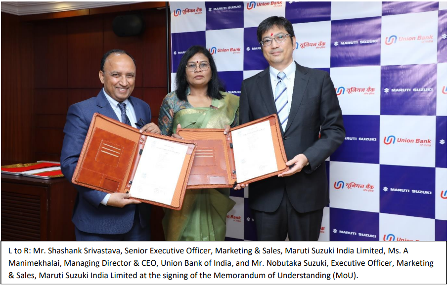 The MoU was signed in the presence of Mr. Shashank Srivastava, Senior Executive Officer — Marketing & Sales, Mr. Nobutaka Suzuki, Executive Officer —Marketing & Sales, Mr. Bhuvan Dheer, Executive Vice President — Sales & Network and Mr. Vishal Sharma, General Manager — Allied Business from Maruti Suzuki; and Ms. A Manimekhalai, Managing Director & CEO, Mr. Rama Subramanian, Executive Director, Mr. Sanjay Rudra, Executive Director, Mr. Nitesh Ranjan, Executive Director and Mr. Nidhu Saxena, Executive Director, Union Bank of India, along with other senior members from both organisations.