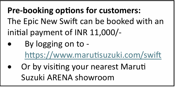 Commenting on the announcement, Mr. Partho Banerjee, Senior Executive Officer, Marketing & Sales, Maruti Suzuki India Limited, said, “The Swift has been an iconic brand for Maruti Suzuki, one that has evolved with changing times to redefine customer expectations. Its 29 lakh strong customer base and numerous awards & accolades are a testament to how the iconic Swift has gone from strength to strength. The Epic New Swift stays true to its much-loved sporty DNA, while balancing new-age expectations of environment friendliness with low emissions. As always, the next-generation Swift is all set to create new benchmarks in the premium hatchback segment and further the concept of the ‘Joy of Mobility’ in its own right.”