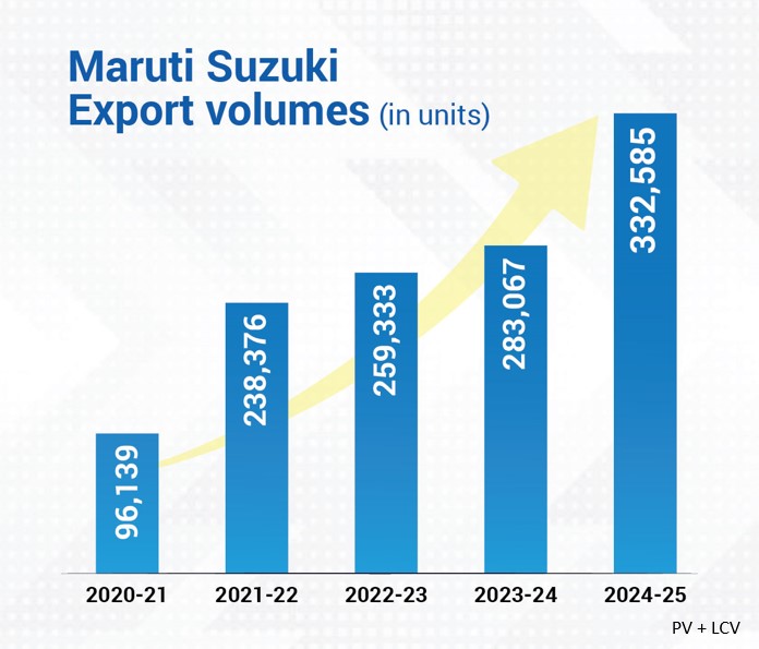 This achievement reinforces Maruti Suzuki’s robust and sustained export growth trajectory. With over 2 lakh vehicles exported in H1 FY 2025-26, the Company grew by around 40% and recorded its highest-ever half-yearly export volume. Maruti Suzuki commands over 46% share* in India’s passenger vehicle exports. In FY 2024-25, the Company had exported over 3.3 lakh vehicles.