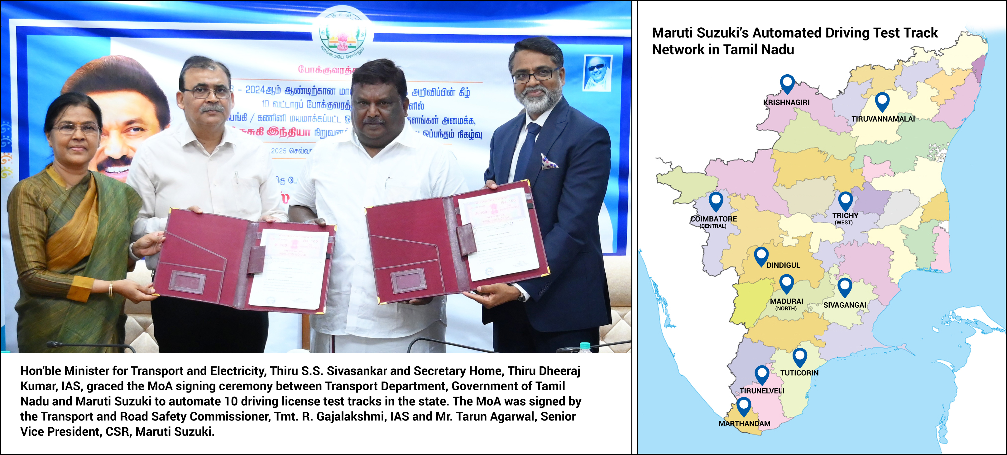Chennai / New Delhi, 14 October 2025: Maruti Suzuki India Limited (“Maruti Suzuki”) signed a Memorandum of Agreement (“MoA”) with the Transport Department, Government of Tamil Nadu to set up 10 Automated Driving Test Tracks (“ADTTs”) across the state.